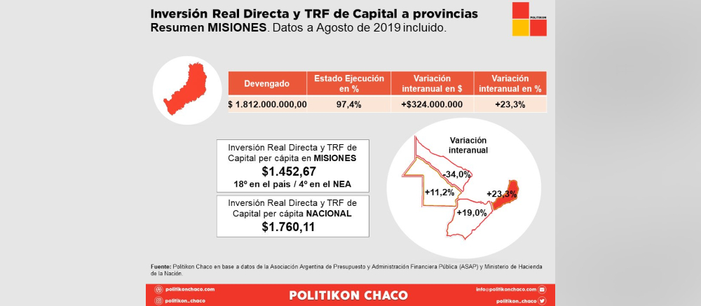 La inversión real directa y transferencias de capital del Gobierno nacional crecieron un 23,3% interanual hasta agosto en la Provincia de Misiones, totalizando $1.812 millones, siendo la que más creció en el NEA, sin embargo, se presenta nuevamente el eterno problema de tener la per cápita más baja.