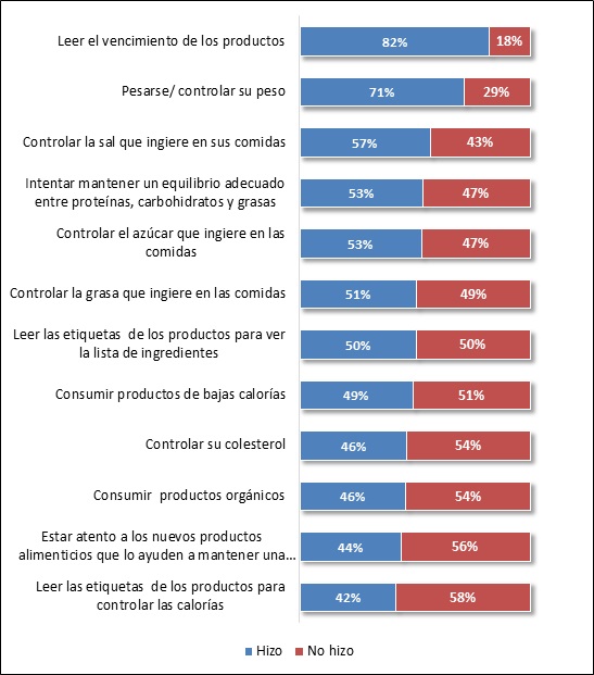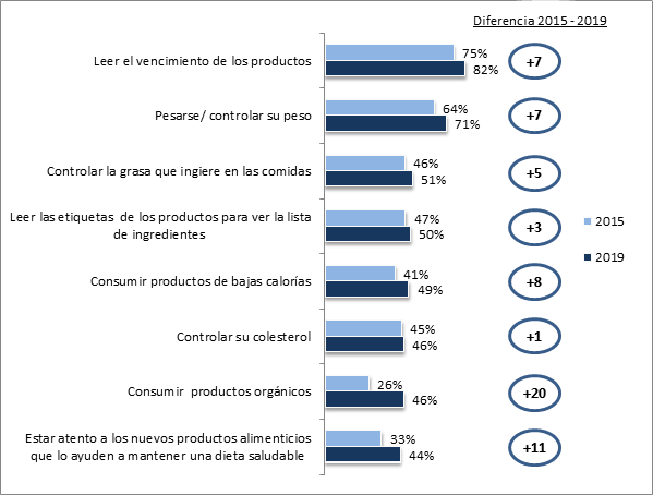 También se incrementó el porcentaje de población que dijo estar atento a los nuevos productos alimenticios que ayuden a mantener una dieta saludable (que pasó del 33% al 44%) y el consumo de productos de bajas calorías (41% a 49% respectivamente). Leer la fecha de vencimiento de los productos que se consumen y pesarse o controlar el propio peso también evidenciaron incrementos que oscilaron los 7 puntos en el período de referencia.