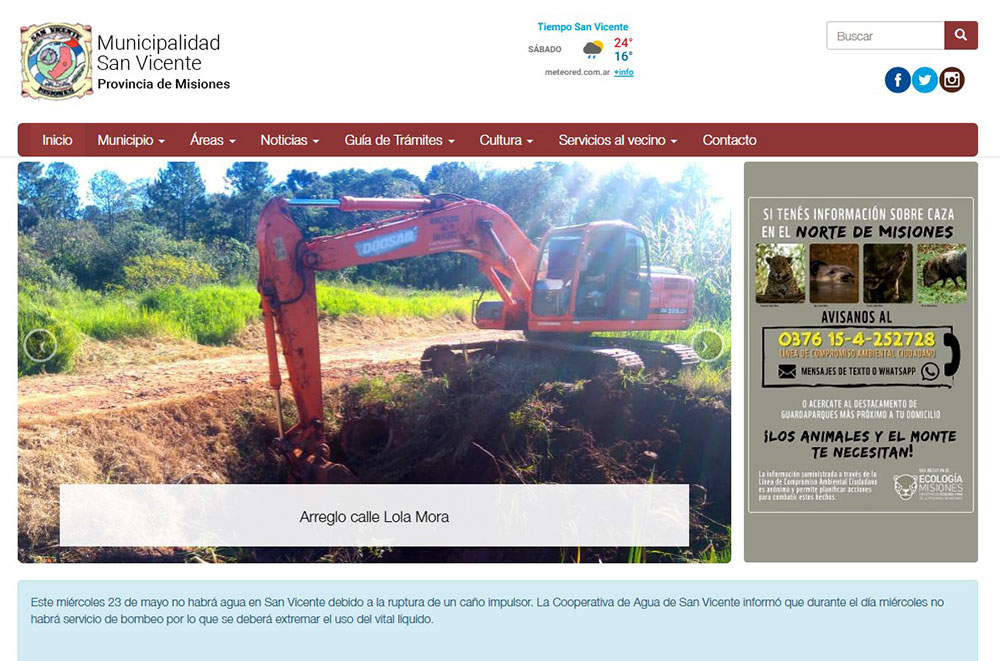 El portal “sanvicentemisiones .gov.ar” es el único medio oficial de la Municipalidad sanvicentina. Sin embargo, está desactualizado. La última información que tiene cargada es del 23 de mayo del año 2018. Pero, por otro lado, este portal sólo era utilizado por el municipio para que se publiquen noticias sobre informaciones o noticias que surgían del Ejecutivo Municipal y no actos de gobiernos como Resoluciones, Ordenanzas, llamados a licitación pública o Programas y Proyectos, presupuestos, plazos, ejecución y supervisión, u otras informaciones institucionales.