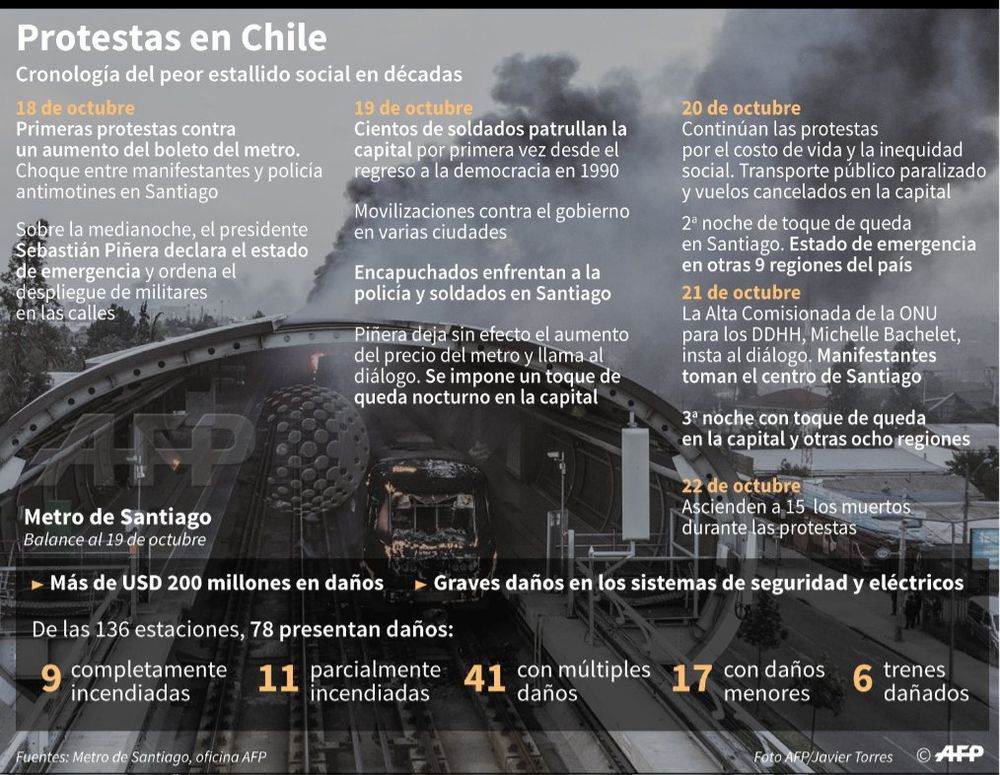 Una creciente criminalización del movimiento estudiantil, los escándalos de corrupción en la Policía y el Ejército, las alzas en servicios básicos, un pobre sistema de pensiones y salud y la desigualdad crónica son las variables que cimentaron la bronca en la sociedad chilena que explotó cuando el gobierno anunció la semana pasada el alza en el pasaje del Metro y derivó en una serie de enfrentamientos entre civiles y carabineros, además de graves daños a estaciones del tren subterráneo y el inmobiliario público en una de las mayores protestas sociales en décadas en Chile.
