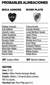 El desafío para el cuestionado Gustavo Alfaro será encontrar el equipo para revertir la floja imagen del primer partido y convertir los tres goles que lo clasificarían a la final. En los once partidos que disputó en la presente edición, Boca sólo ganó tres con más de dos goles de diferencia: 3-0 al Tolima colombiano y 4-0 ante Jorge Wilstermann, de Bolivia, ambos en la fase de grupos y como local, y el 3-0 en Quito ante Liga Deportiva por los cuartos de final. River, en tanto, está invicto en la Copa Libertadores y además suma una racha de seis clásicos sin perder con cuatro triunfos y dos empates.