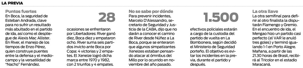 Boca apostará por su jerarquía individual y por la mística de su escenario para buscar un gol en los primeros minutos del partido y con ese contagio encontrar el juego y resto de los tantos que le permitan revertir la serie. En este punto, River tiene la ventaja del resultado a favor y la de tener un equipo que respeta la idea futbolística que hace más de cinco años transmite el Muñeco Gallardo, un DT que además se convirtió un experto de los duelos mano a mano, con 50 triunfos en las 61 series que disputó.