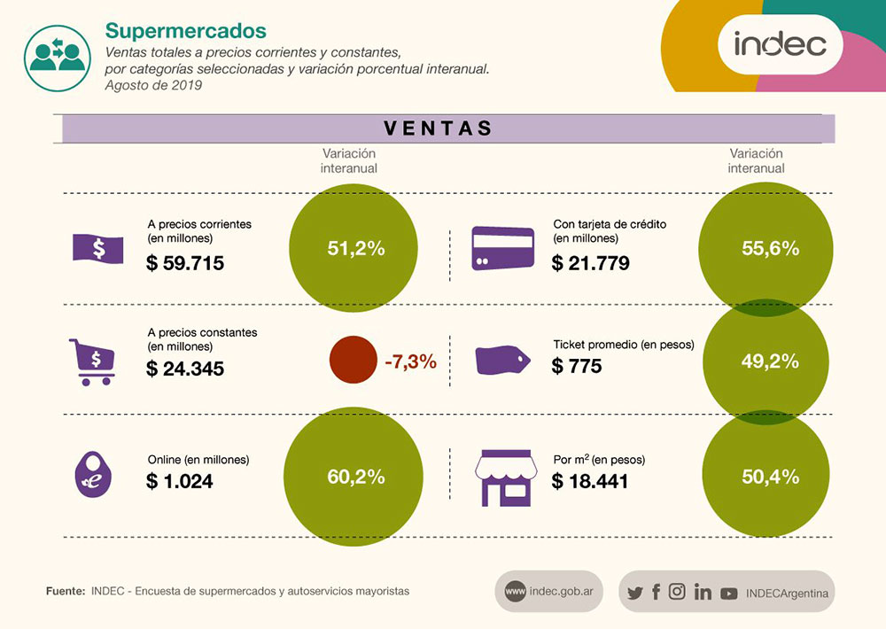 “Las ventas de supermercados a precios constantes de diciembre de 2016, durante agosto de 2019, sumaron un total de $24.344,8 millones, lo que representa un aumento de 3,2% respecto del mes anterior y una caída del 7,3% respecto a agosto de 2018”, precisó el INDEC.