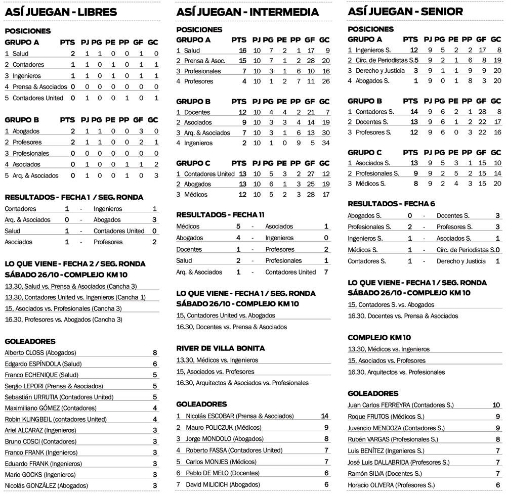 En Intermedia hubo goleada de Médicos, Abogados y Contadores United; y en Senior vencieron Docentes, Profesores y Médicos, con empates de Ingenieros – Asociados y Contadores – Derecho y Justicia, ambos por 1-1. El fin de semana arrancan la segunda ronda.