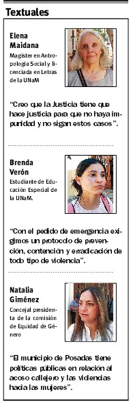 Así lo confirmó la presidenta de dicha comisión, Natalia Giménez: “Vamos a reunirnos con representantes de las organizaciones políticas y estudiantiles que nos acercaron este petitorio para trabajar el tema. Tenemos que generar políticas públicas para que la violencia contra la mujer termine. La ciudad de Posadas es la primera y única que tiene campaña contra el acoso callejero”, reconoció Giménez.