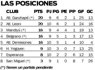 En uno de esos duelos, Atlético Demisiones obtuvo una trabajosa victoria sobre San Miguel, al que superó por 3-2. El “Tricolor” sumó tres puntos importantísimos de cara a la lucha por los primeros lugares del torneo que sigue teniendo a Atlético Garuhapé y Atlético Leoni como punteros.