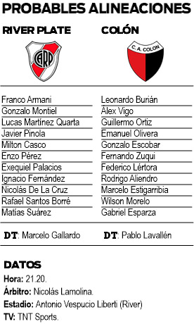 Gallardo dispondrá de la mejor formación posible. La misma que repitió en la serie exitosa ante Boca, con relevos de categoría como Ignacio Scocco, Lucas Pratto y Juan Fernando Quintero.