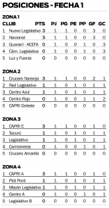 En la 3, CAPRI C venció 1-0 a Camioneros y Tacurú y Legislativo igualaron 1-1, Crucero Amarillo tuvo día libre. En la 4, CAPRI A venció 1-0 a Centro A y fue empate 1-1 entre Misión Legislativo y Pirá Porá, quedó libre Legislativo B.