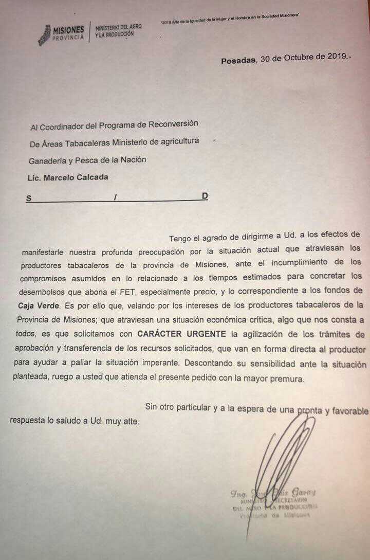 En la nota le solicita “en carácter de urgente” realizar las correspondientes gestiones destrabar los fondos de “precio y caja verde”, para “paliar la crítica situación imperante” de los productores misioneros.