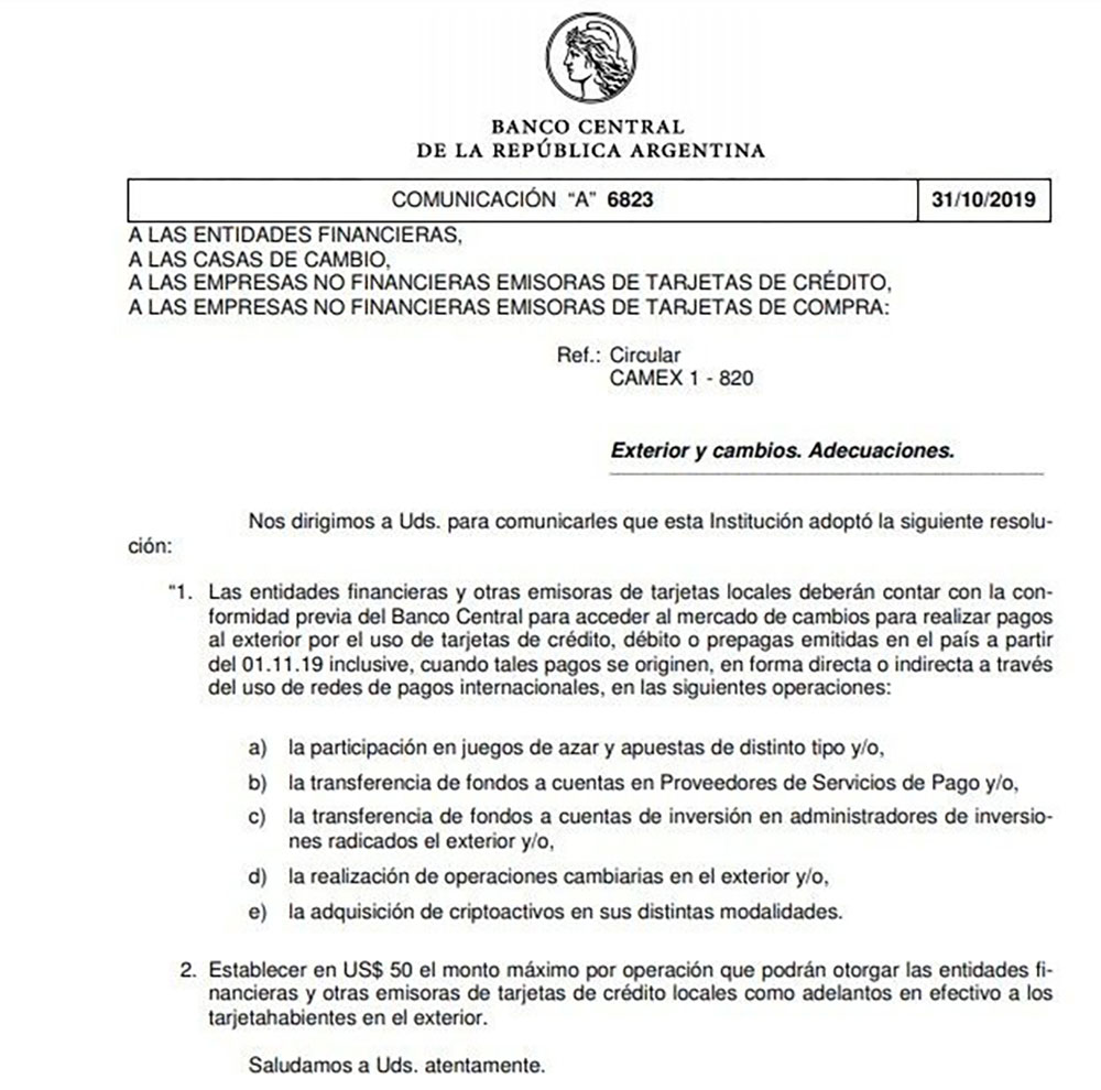 Mediante la comunicación “A” 6823, la autoridad monetaria determinó también que bancos y emisoras de tarjetas locales “deberán contar con la conformidad previa del Banco Central para realizar pagos al exterior por el uso de tarjetas de crédito, débito o prepagas emitidas en el país a partir del primero de noviembre inclusive”.