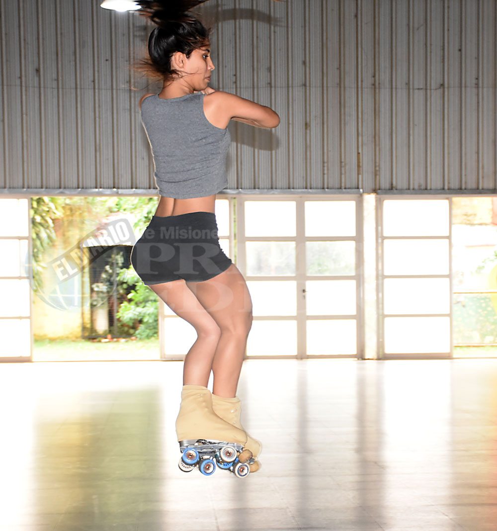 En la foto central se aprecia una de las figuras que realizó Milagros Vianna, en el entrenamiento que se produjo esta semana en el tradicional club posadeño, que anunció que participará de la competencia apostoleña con una delegación de 35 patinadores, en distintas categorías.