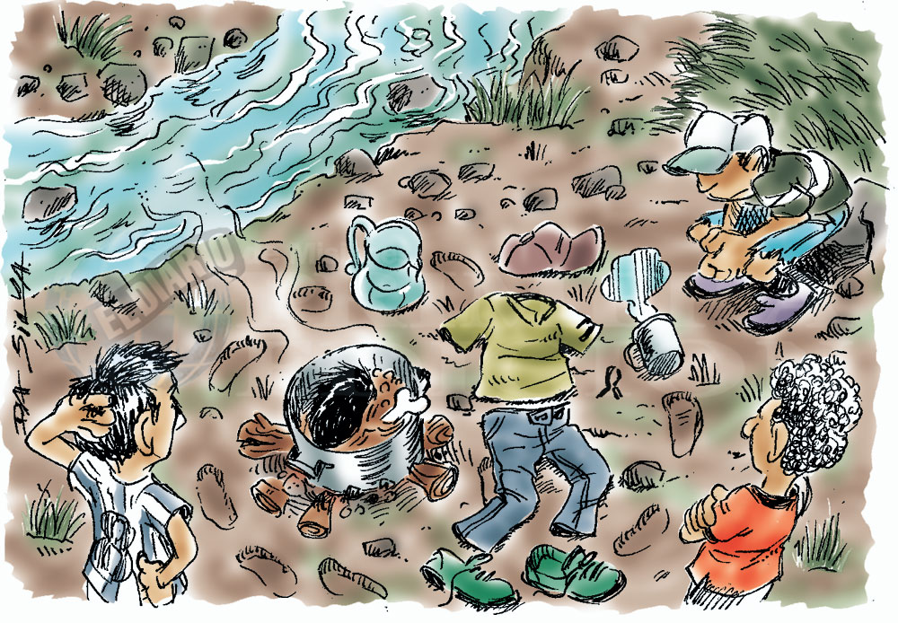 Apenas entraron, en el mogote de montecito donde estaba la vertiente, vieron que había una fogata apagada y una olla arriba de los trozos de palos con restos de cenizas. Adentro había algo cocido, parecía un revoltijo de pelo negro y huesos. No podían saber qué era, pero ya se imaginaron. Cerca de la olla estaban los restos del libro, al lado estaba el pullover que usó Jorgito la noche anterior.