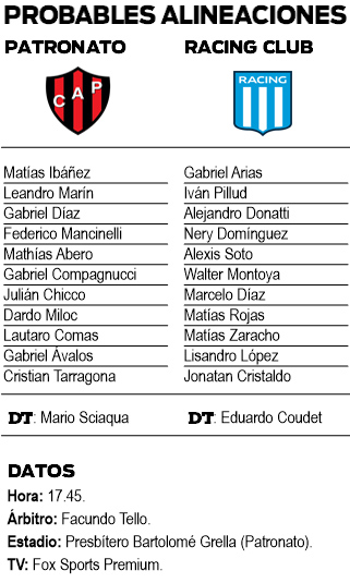 El Racing de Coudet no ofrecerá variantes respecto de la formación que igualó en Avellaneda con Banfield. En tanto que en Patronato se producirá el regreso de Lautaro Comas, recuperado de un desgarro en el gemelo derecho sufrido en la octava fecha en el empate ante Lanús, en lugar de Santiago Rosales, cuyo pase pertenece a Racing y por una cláusula no podrá jugar.