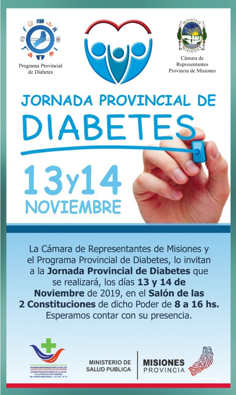 En el marco del Día Mundial de la Diabetes que se conmemora el 14 de noviembre de 2019, desde la Cámara de Representantes de Misiones y el Ministerio de Salud Pública de Misiones, a través del Programa Provincial de Diabetes, informan que se realizarán actividades destinadas a profesionales de la salud y a la comunidad en general. El evento es auspiciado y apoyado por el Hospital Escuela de Agudos “Dr. Ramón Madariaga”.
