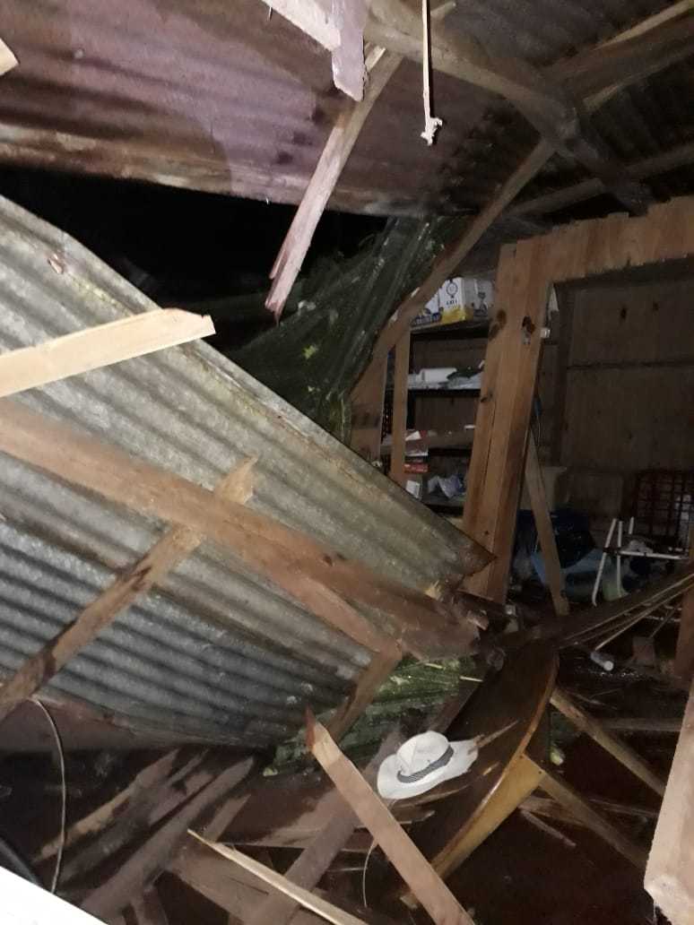 El derrumbe de este “añoso” ejemplar provocó un daño casi total en el techo de la casa, como así también en los muebles de la vivienda, al igual que las paredes de madera de machimbre.