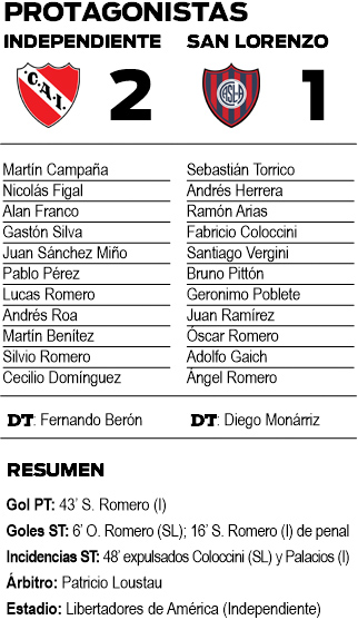 Hubo dos Romero por lado, ya que además de los mencionados estuvieron por el local el volante Lucas y por la visita Ángel, hermano gemelo del anterior, y esa “paridad” también se trasladó al juego, donde la superioridad de Independiente en el marcador no se tradujo literalmente en la cancha.