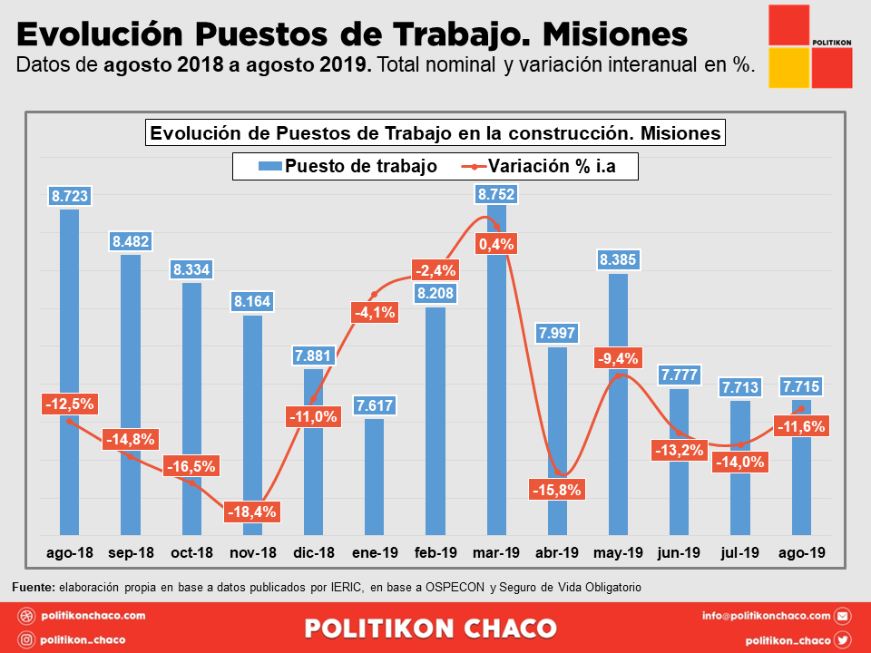 Por su parte, Misiones tuvo una caída interanual del 11,6% (la más baja del NEA), y totalizó 7.715 trabajadores en el sector. De esa manera, en la provincia hay 1.008 empleos menos en el sector que hace un año.