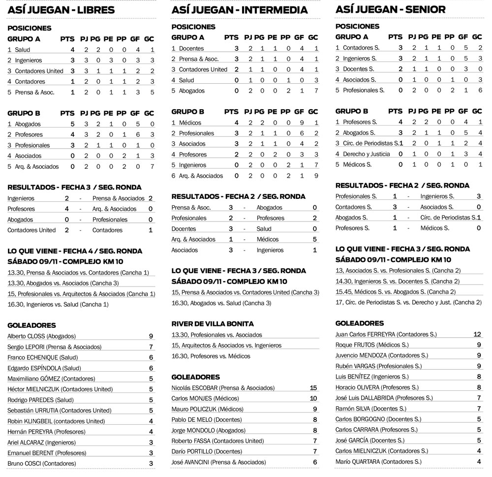 En Intermedia, hubo goleadas: Prensa & Asociados venció 3-0 a Abogados y Médicos le hizo cinco a Arquitectos que logró hacer uno para el resultado final de 5-1. En Senior, hubo triunfos de Ingenieros, Contadores y Profesores, mientras que Abogados y Círculo de Periodistas, terminaron en empate. El sábado, la próxima fecha.