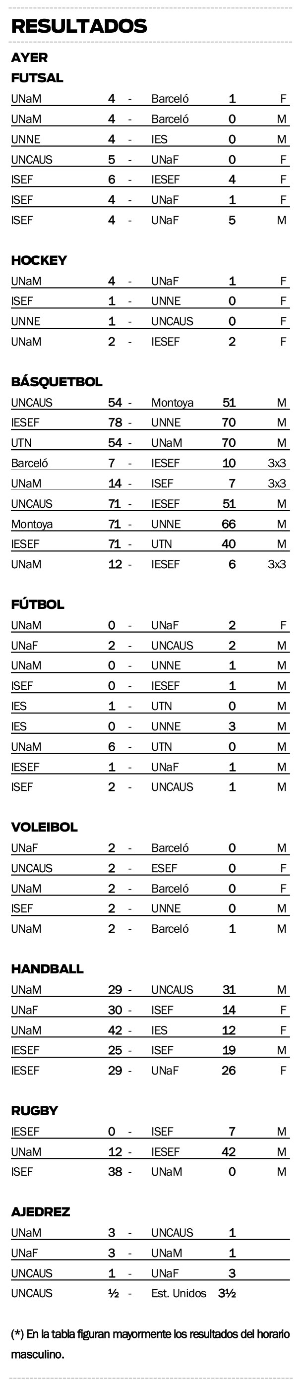 En esta lucha por acceder a las instancias decisivas, la Universidad Nacional de Misiones, el Instituto Superior Antonio Ruiz de Montoya y la Universidad Gastón Dachary, los tres representantes misioneros, tendrán hoy un nuevo día cargado de actividades, donde buscarán asegurarse un lugar en las finales de mañana, en las diferentes disciplinas que participan.