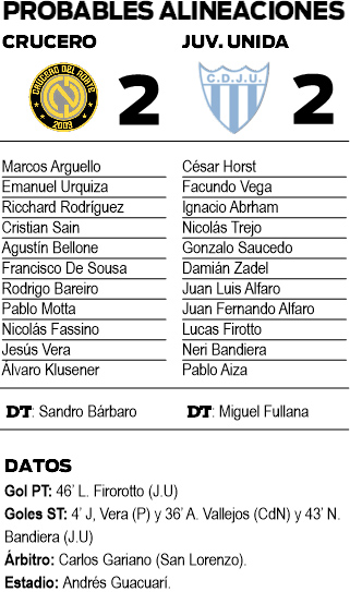A los 4 minutos, Crucero llegó a la igualdad. Luis Alfaro le cometió una falta dentro del área a Jesús Vera y el mismo delantero fue el encargado de cambiar la falta por gol con remate a la izquierda de un arquero rival, que se tiró al otro palo.