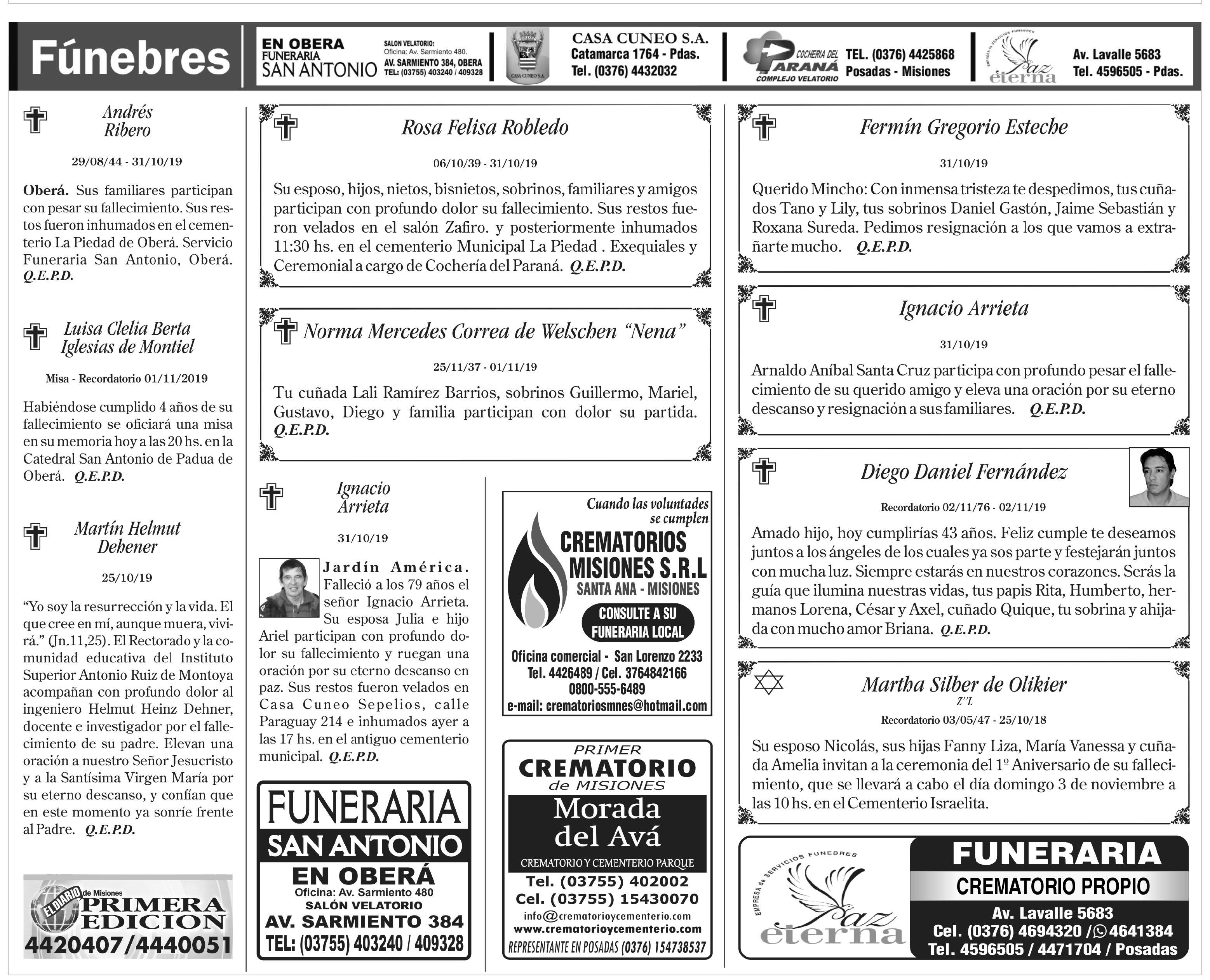 Fúnebres del sábado 2 de noviembre de 2019
