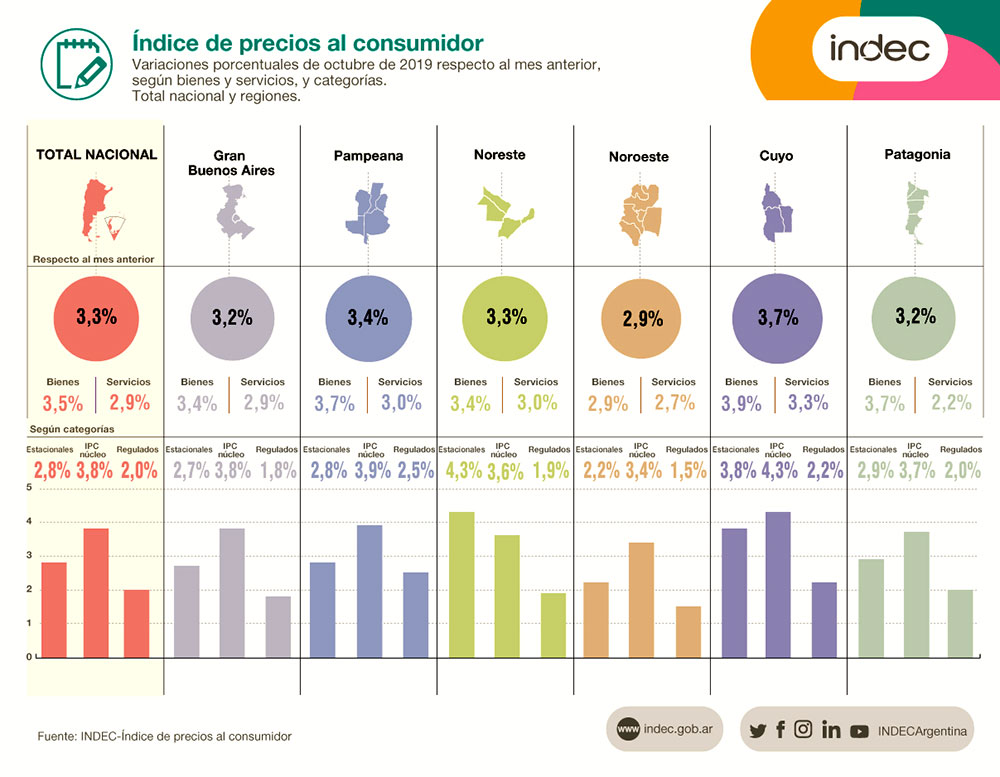La inflación de octubre se desaceleró al 3,3%, sin embargo el acumulado de 2019 llegó al 42,2%, según informó este jueves el Instituto Nacional de Estadísticas y Censos (INDEC).