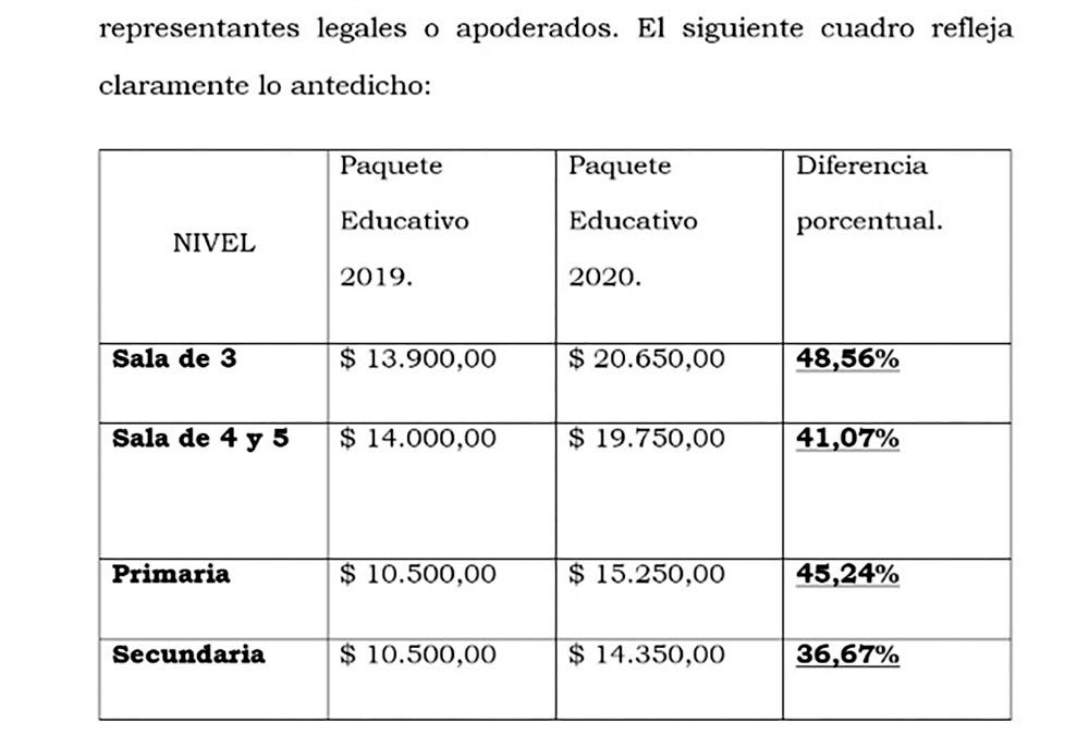 “El lunes 4 de noviembre se oficializó la aprobación de hasta un treinta y cinco por ciento (35%) en el aumento del valor de las cuotas para las instituciones privadas de la provincia de Misiones, En el caso de nuestra institución educativa los valores superan ampliamente el tope máximo del 35% que fuera aprobado y autorizado por el SPEPM”, señala el escrito.