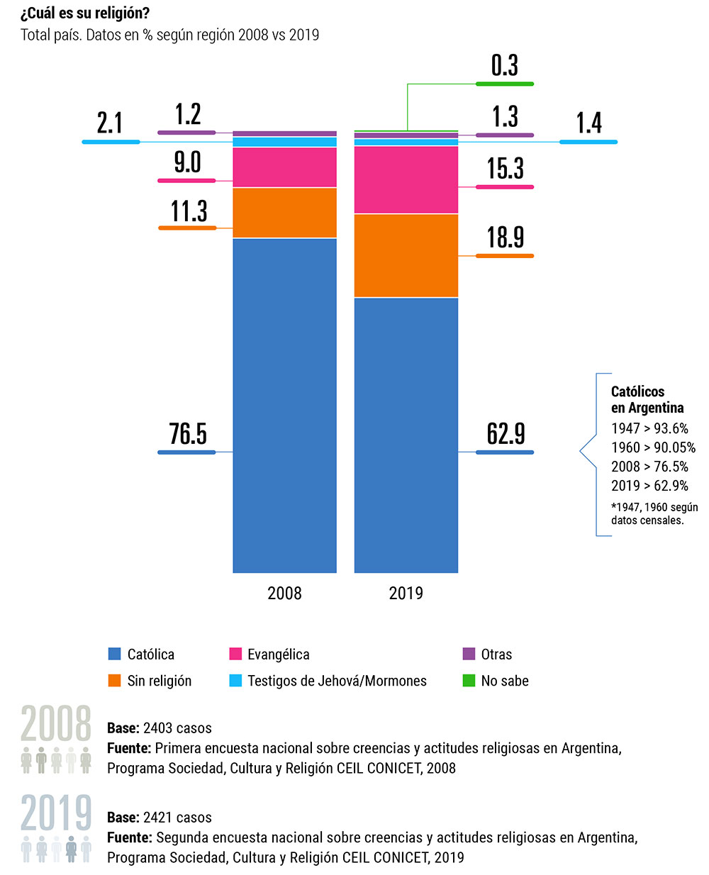 A once años de la primera Encuesta Nacional de Creencias y Actitudes Religiosas, los primeros datos que se observan en la segunda son que “el catolicismo disminuye aunque conserva una mayoría atenuada del 62,9%, mientras que las personas sin religión ascendieron al 18,9% y los evangélicos al 15,3%”.