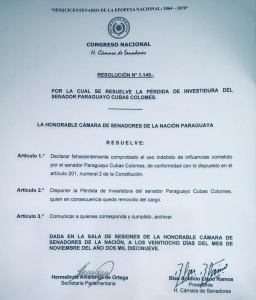 Este jueves tras una asamblea extraordinaria, en el Congreso paraguayo, senadores aprobaron la expulsión del legislador Paraguayo Cubas, luego del incidente que tuvo con efectivos policiales en el Departamento de Alto Paraná.