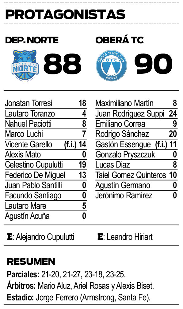 Pero Norte no se iba a dejar vencer tan fácilmente y logró emparejar las cosas gracias a un doble de Cupulutti y cuatro puntos de De Miguel. Faltando un minuto el local perdía por 7 y en una ráfaga llegaron a estar 86-87 con 23 segundos por jugar. Oberá hizo valer su ataque y un libre de Díaz decoró el resultado final que fue 88-90.