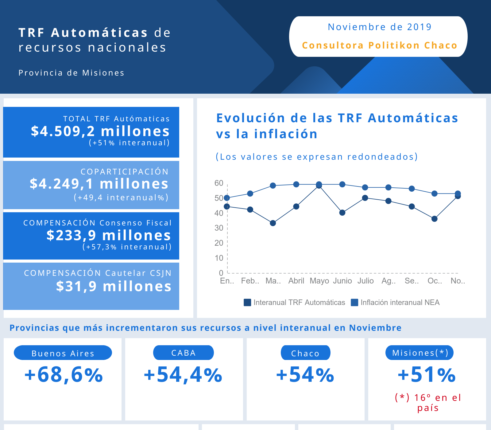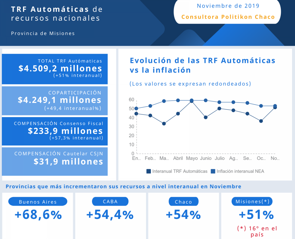 En relación con la inflación, si se toma el dato acumulado interanual del NEA de octubre (último dato oficial disponible), el mismo fue de 53,3%; y considerando que aún no se conoce el dato oficial de la inflación de noviembre, si se comparan los ingresos por transferencias automáticas de noviembre de Misiones con la inflación de octubre, los mismos estuvieron 2,2 puntos por debajo.