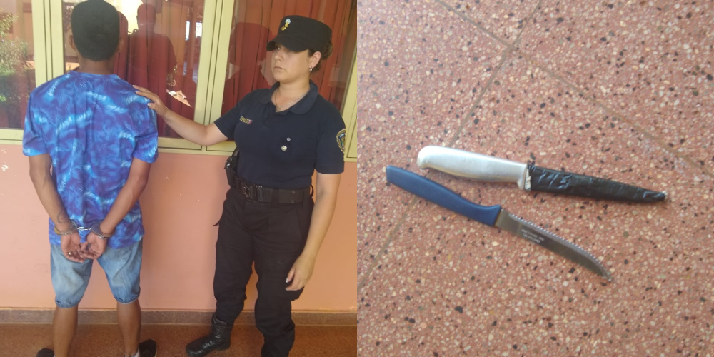 Con datos aportados por el joven, los uniformados iniciaron un amplio rastrillaje y ubicaron al señalado, de frondoso prontuario, en la intersección de las avenidas Cocomarola y José Cabrera quien fue detenido y alojado en sede policial a disposición del Juzgado de Instrucción N° 1. Así también, secuestraron dos cuchillos que tenía en su poder.