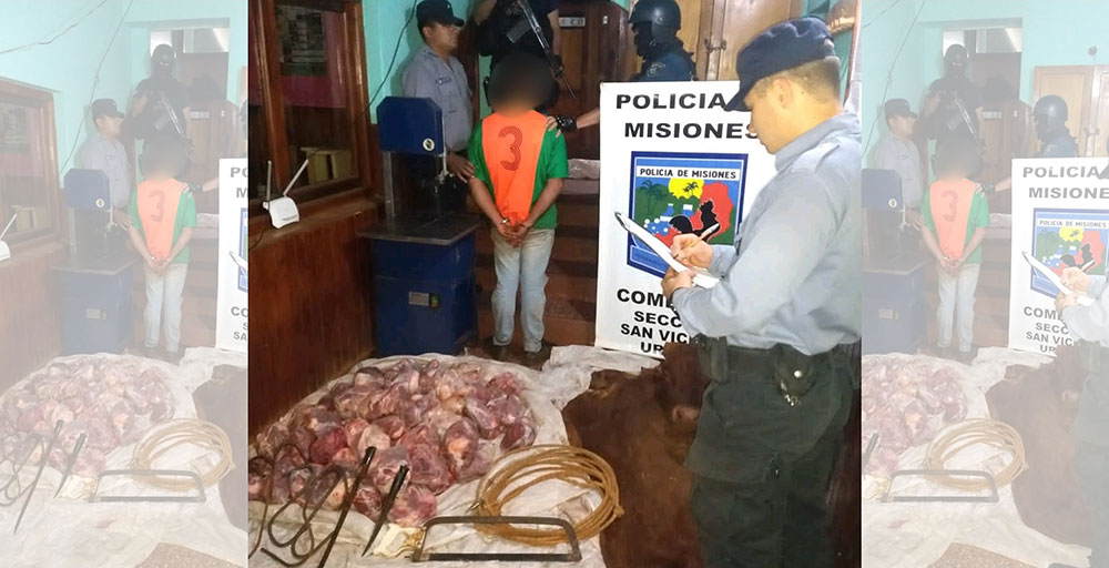 Así, con orden de allanamiento del Juzgado de Instrucción 3 de San Vicente, los uniformados ingresaron al domicilio donde en un sector de corral hallaron las herramientas de carnicería, restos de un animal vacuno (cuero, cabeza), 70 bolsas de nylon con carne roja pesada y fraccionada para la venta. Se detuvo al ocupante del inmueble que fue trasladado a sede policial.