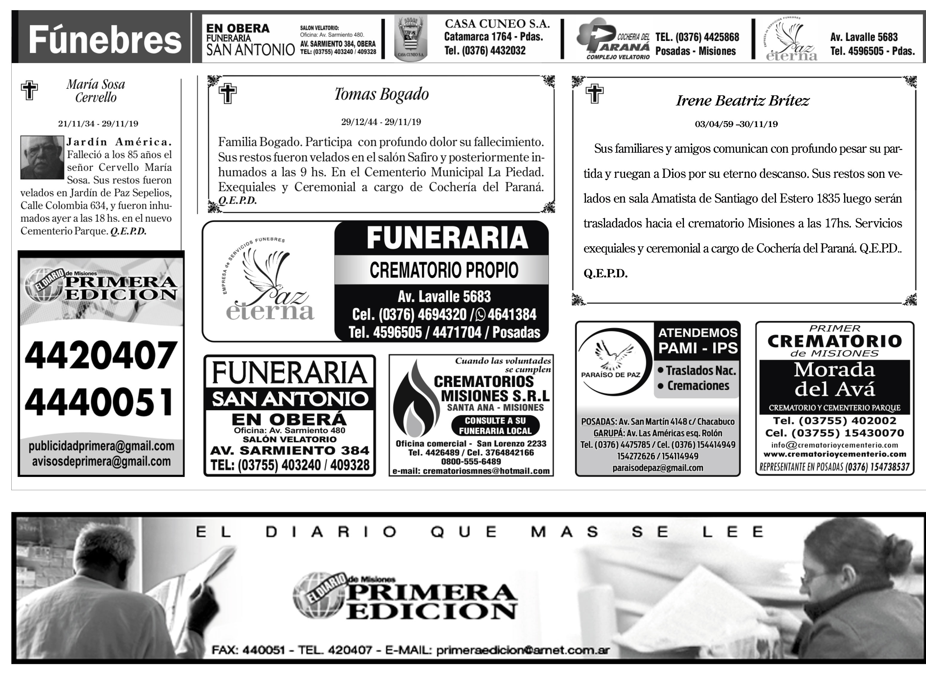 Fúnebres del miércoles 4 de diciembre de 2019