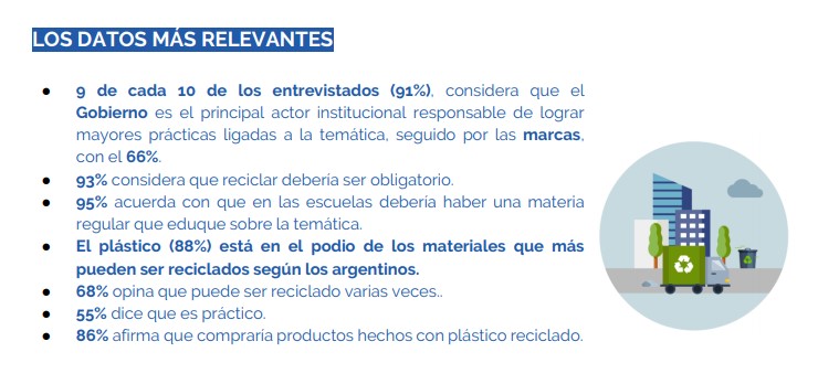 La encuesta reveló que “el 93% de los entrevistados considera que reciclar debería ser obligatorio y el 95% coincide con que en las escuelas debería haber una materia curricular que eduque sobre la temática”. Además “el 91% considera que la falta de políticas públicas es la principal causa que impide una mayor separación de residuos y el reciclado, sumado al 66% que también menciona a las marcas como responsables”.