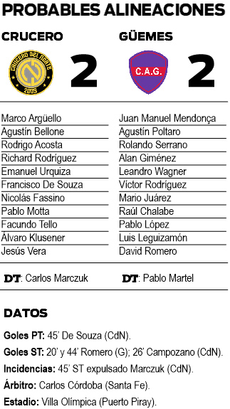Vale aclarar que a Crucero no le cobraron un claro penal por una mano que cometió Luis Leguizamón, pero el árbitro Carlos Córdoba, de pobre actuación, hizo caso omiso.