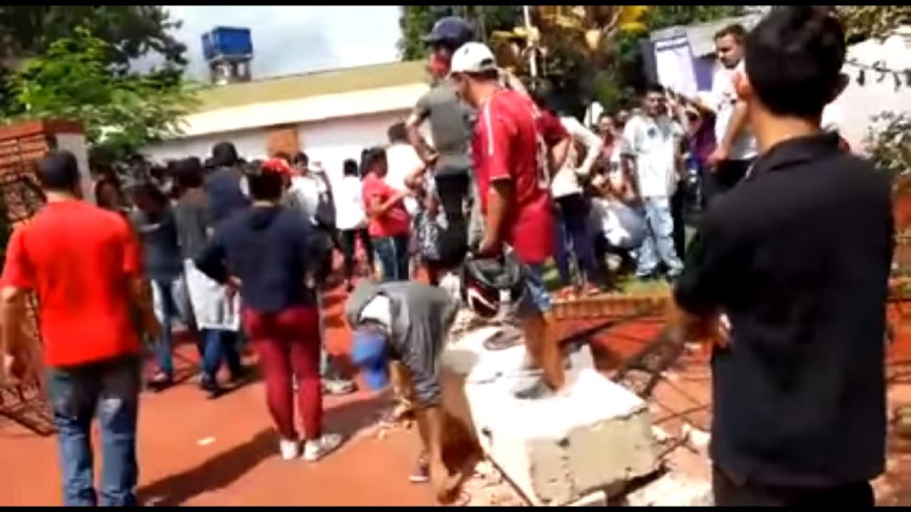 En ese lapso, los protestantes que quedaron afuera rompieron los portones, vidrios y tiraron piedras. El descontrol se apoderó de los militantes opositores. Hubo heridos y varios con problemas de salud, pero los manifestantes no dejaron entrar a la ambulancia para que estos puedan recibir atención médica.