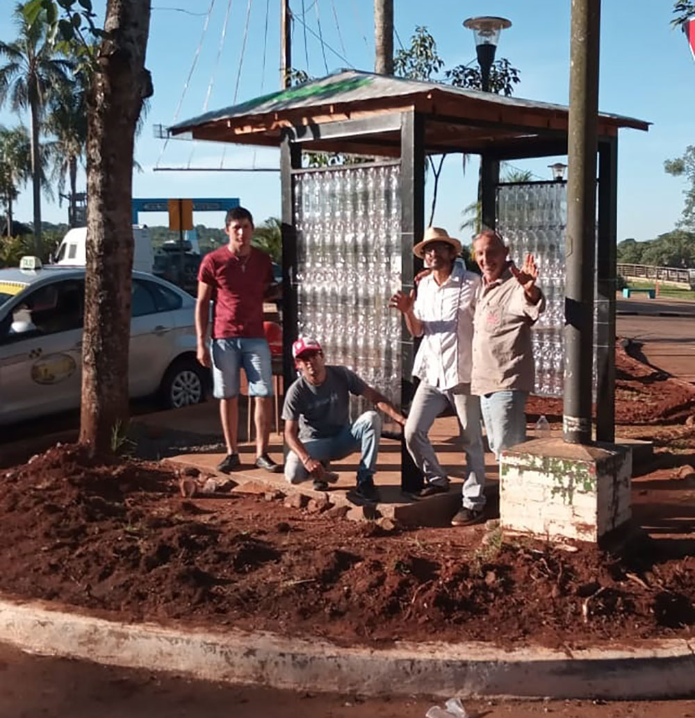 Fredy Ríos, presidente de la Asociación Paradas Unidas, contó a PRIMERA EDICIÓN que “ya está tomando forma el primer resguardo ecológico realizado con botellas plásticas. El techo está hecho con tetra packs y botellas plásticas que están hechas como tejas, las paredes también son de botellas plásticas y también comenzamos con el embellecimiento de la plazoleta donde está emplazado el resguardo”.