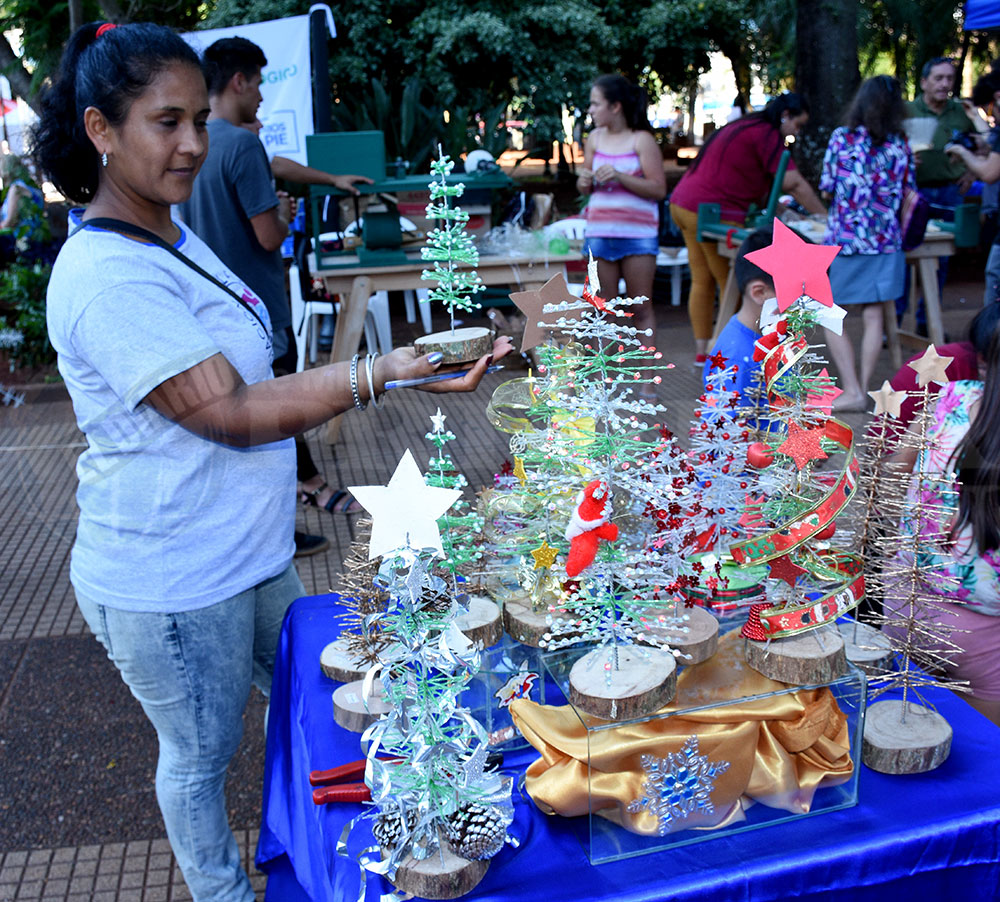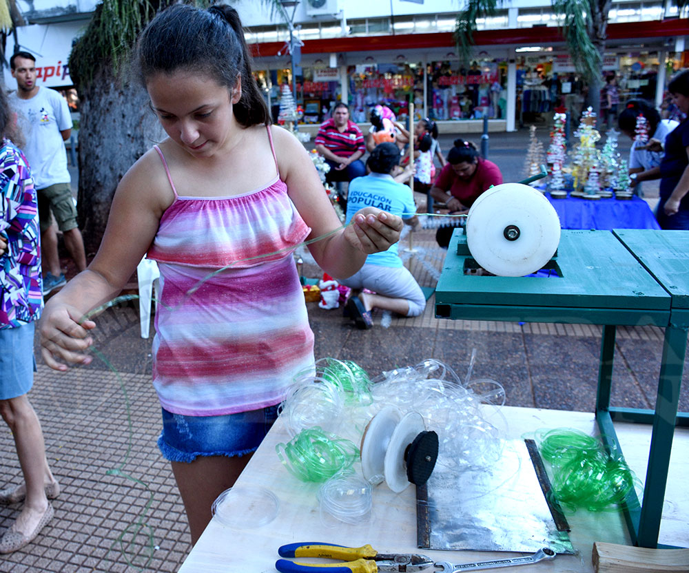 El centro posadeño se transformó en un lugar de enseñanza, exhibición y puesta en escena de árboles de Navidad, escobas y escobillones reciclados y confeccionados a partir de botellas plásticas, de las que se saca el sorprendente “hilo ecológico”.