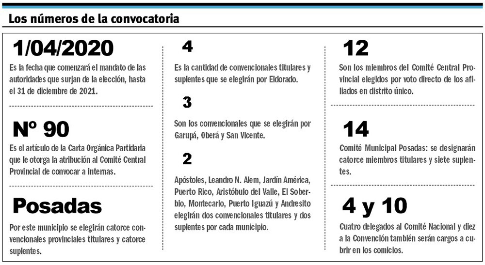 Un mes después, el 1 de abril asumirán las autoridades electas cuyo mandato se extenderá hasta el 31 de diciembre de 2021. Uno de los datos más significativos de esta convocatoria es que las listas que quieran competir por la conducción provincial deberán tener avales en, por lo menos, un tercio de los comités municipales, es decir 26 municipios.