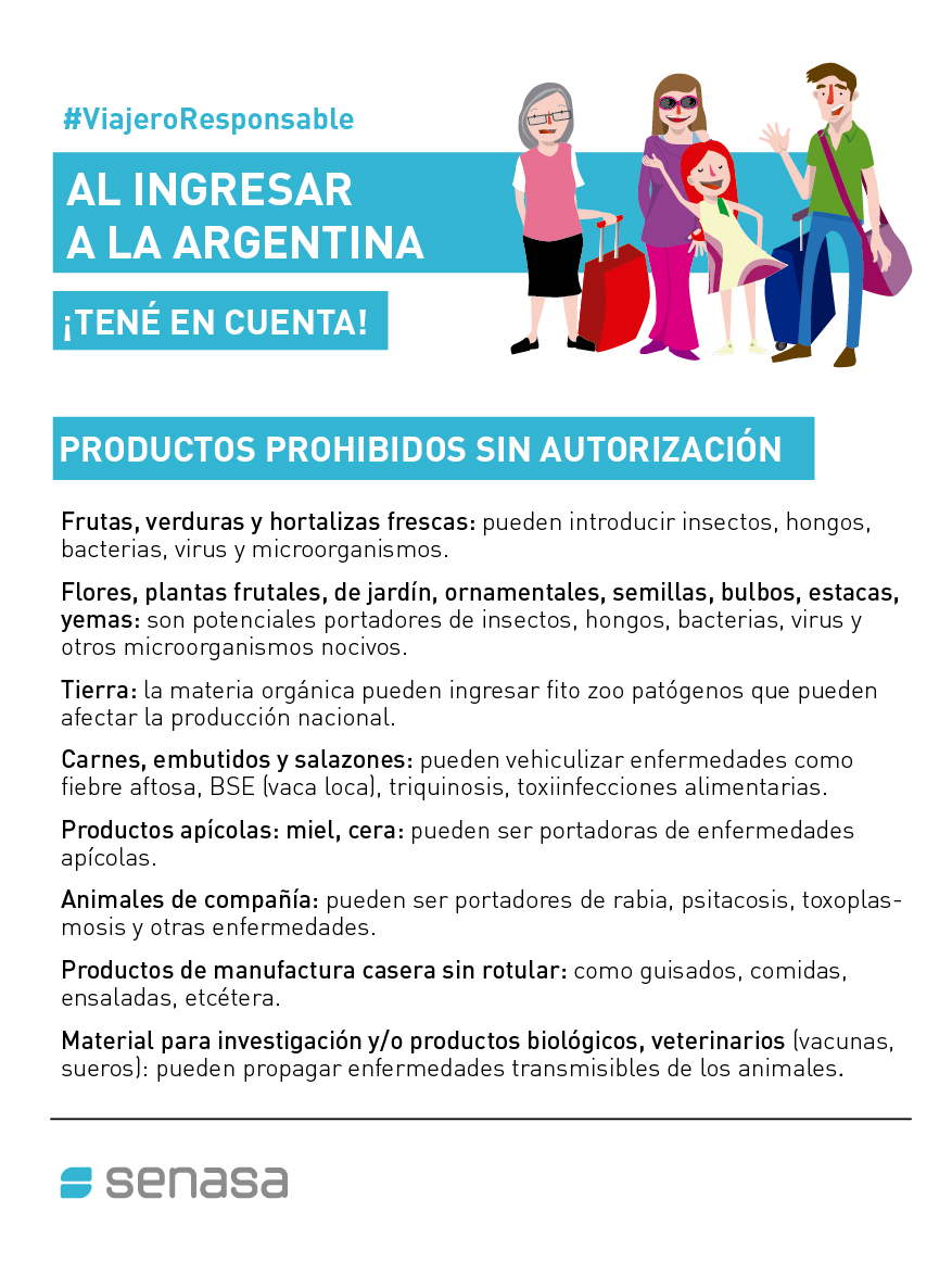 Por ello el Senasa recomienda a los pasajeros que vayan a retornar al país por pasos terrestres, aeropuertos, o por vías fluviales o marítimas, se informen acercándose a cualquiera de sus oficinas distribuidas en todo el país en su página web sobre los productos y subproductos de origen animal y vegetal prohibidos de ingresar sin la autorización correspondiente.