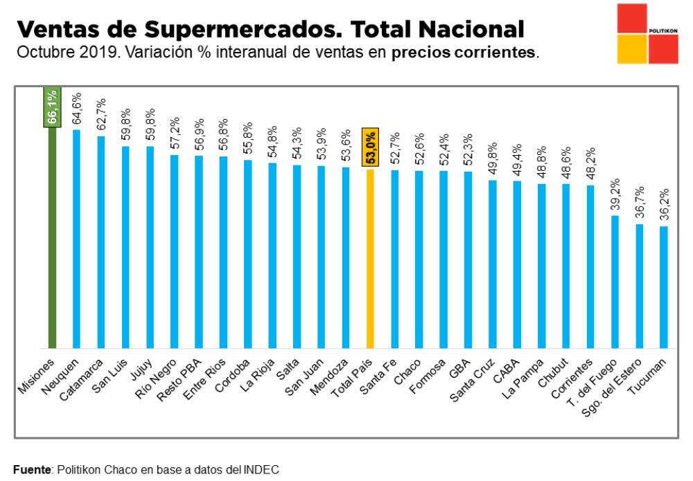 La provincia de Misiones registró el crecimiento más alto, a nivel país, en relación a las ventas en supermercados, alcanzando un total de $1.032,2 millones durante octubre. La cifra representa un incremento (a precios corrientes) del 66,1% en comparación con el mismo mes del año pasado; mientras que comparado con septiembre el crecimiento fue del 10,8%.