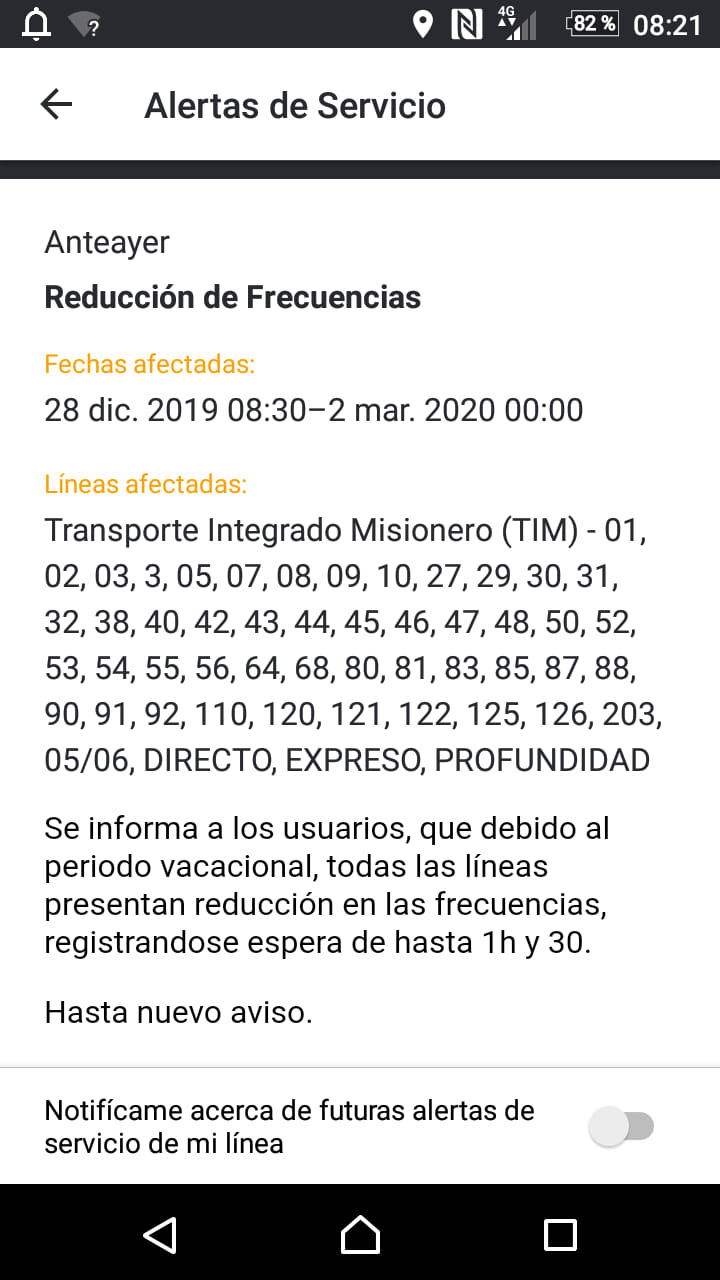 La empresa lo hizo oficial a través de la aplicación Moovit donde se informó a los usuarios que debido al período vacacional todas las líneas presentan reducción de frecuencias en el Transporte Integrado Misionero.