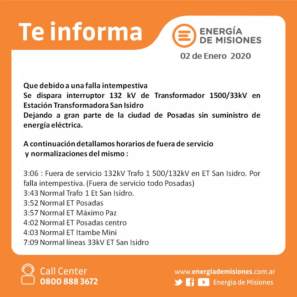 Energía de Misiones informó que una falla intempestiva que disparó el interrumptor 132 kV de Transformador 1500/33Kv en Estación Transformadora San Isidro.