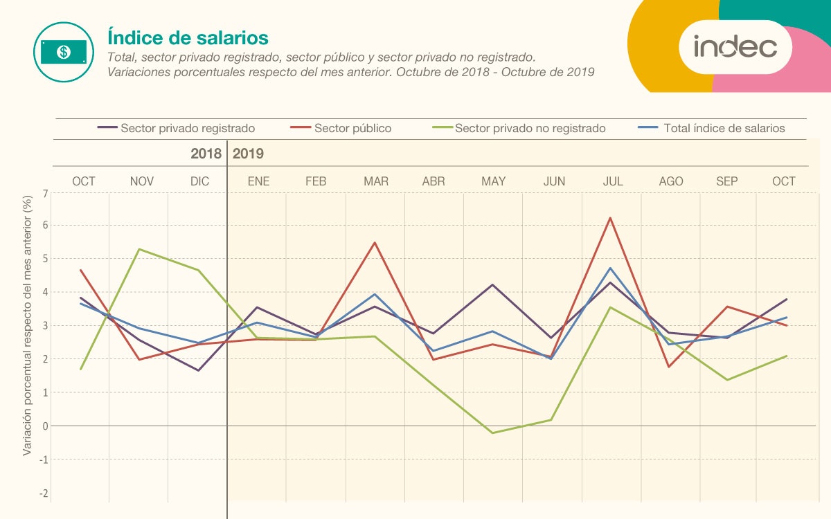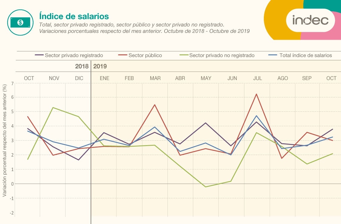 La suba de octubre, en la que tuvo impacto el bono de 5.000 pesos que otorgó el anterior gobierno, se debió a un aumento del 3,5% en los salarios registrados y del 2,1% en el sector privado informal o en negro.