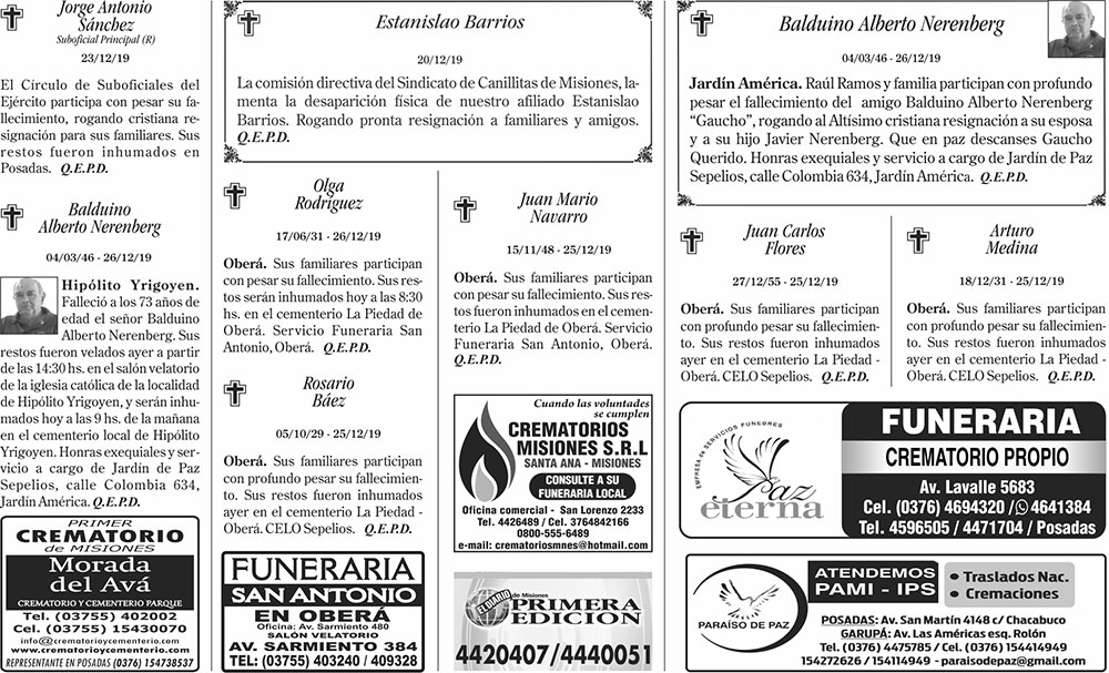 Fúnebres del viernes 27 de diciembre de 2019