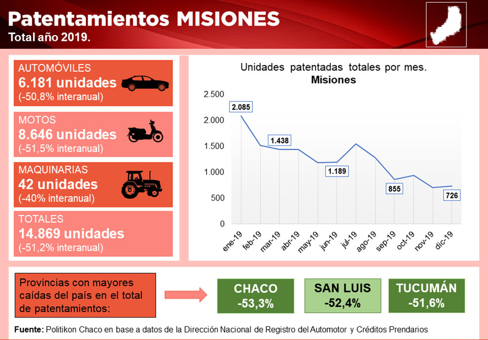 En Misiones durante todo el 2019 se patentaron un total de 14.869 unidades: esto equivale a una caída respecto al 2018 del 51,2%, siendo así la cuarta más alta del país y segunda en el NEA, detrás de Chaco.