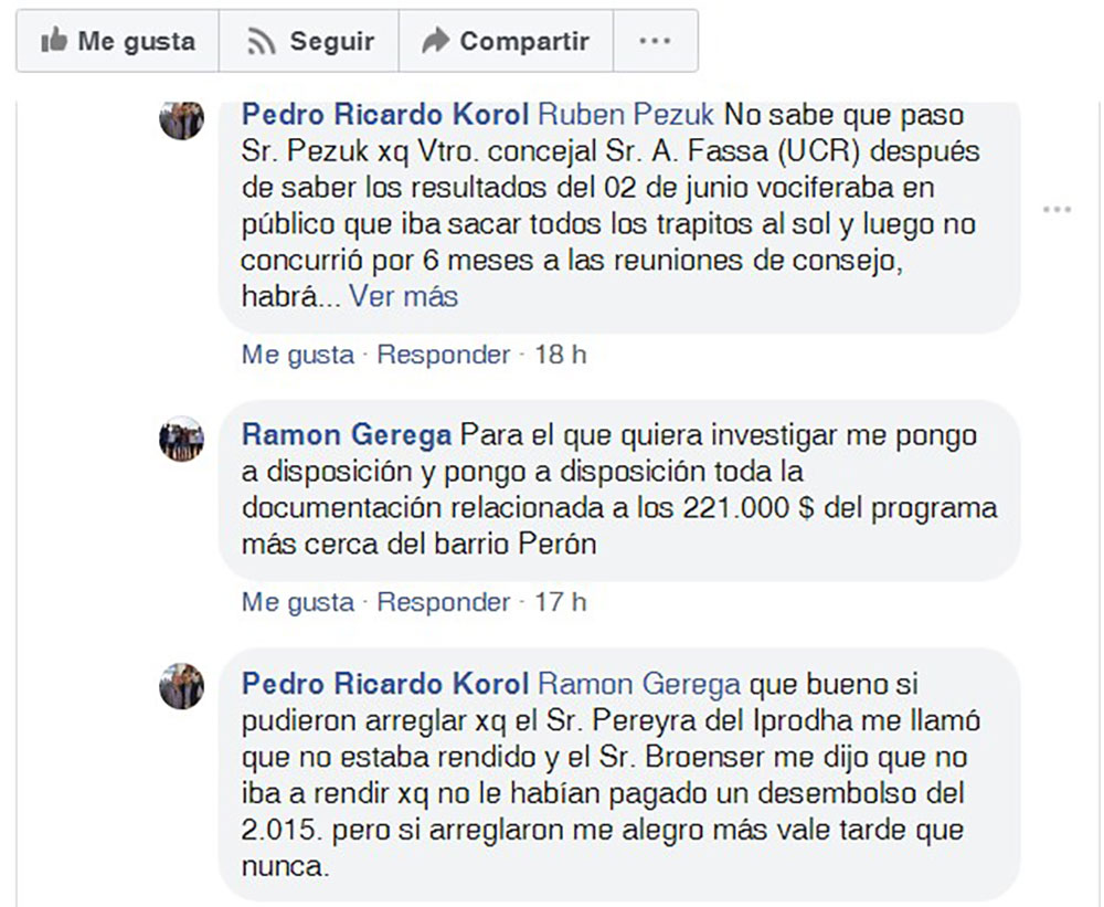 Justamente la solicitud no cayó nada bien entre los renovadores que responden a Korol y opositores al jefe comunal Ramón Gerega. Incluso ambos protagonizaron un intercambio de opiniones en la red de Facebook.
