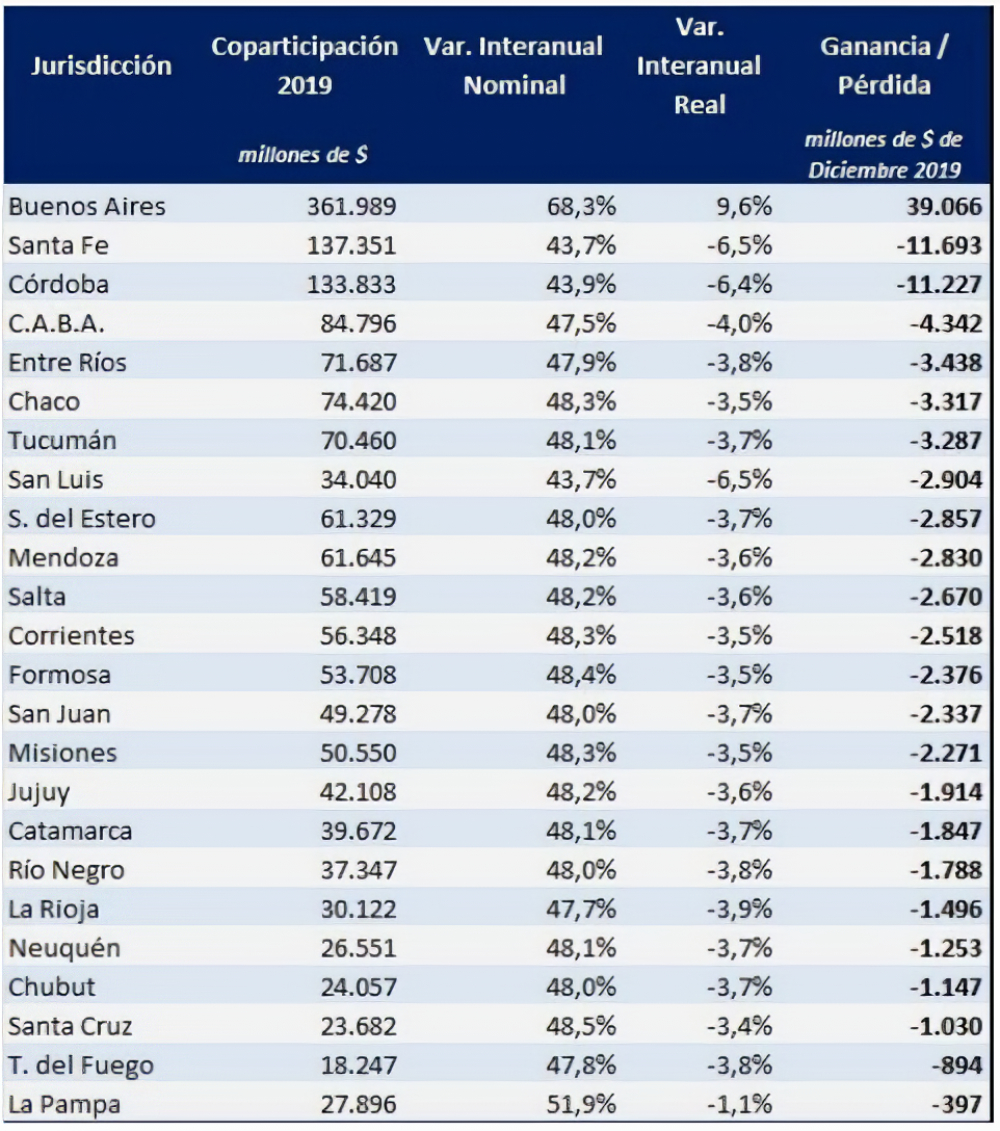 El informe destaca que: “Se observa que Buenos Aires, que es la única provincia que evidenció un incremento en la coparticipación mayor a la inflación, recibió más fondos que en 2018 por un equivalente a $39.066 millones de diciembre 2019. Todas las otras provincias perdieron dinero en la comparación interanual, entre $12.000 millones y $400 millones (a moneda de diciembre de 2019). Estos montos se ven afectados tanto por las variaciones reales de coparticipación, como por los montos de coparticipación que reciben”.