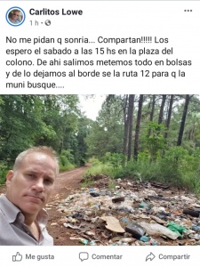“Ya está. Ya ganaron las elecciones. Ahora a hacer algo con esto. Esa foto saqué hoy (en referencia al domingo) paseando por los caminos turísticos de Eldorado. ¿Qué hacemos? ¿Alguien me ayuda a juntar? Los espero el próximo sábado por la tarde. Traer pala y bolsas de consorcio”, reza la publicación de Lowe en la que llama a los vecinos a sumarse el sábado a las 15 en la Plaza del Colono del kilómetro 6.